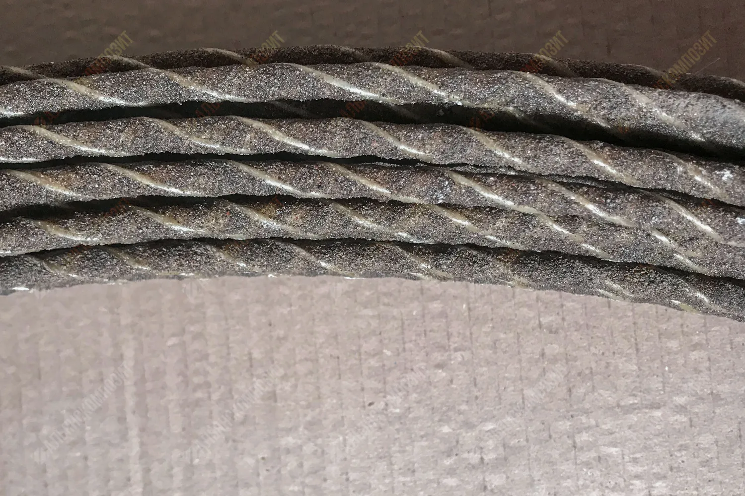 Материал стержня: стеклоровинг. Для уплотнения стеклянных волокон в стержне арматуры жгут стеклопластика перетянут нитью.